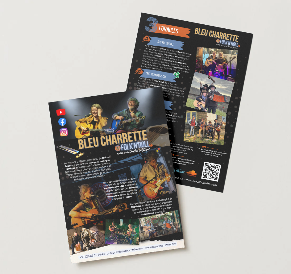 folk, americana, blues, pop-rock, avec une touche celtique☘️. Des harmonies vocales fondantes, la « signature » Bleu Charrette, guidées par le son des instruments multiples.